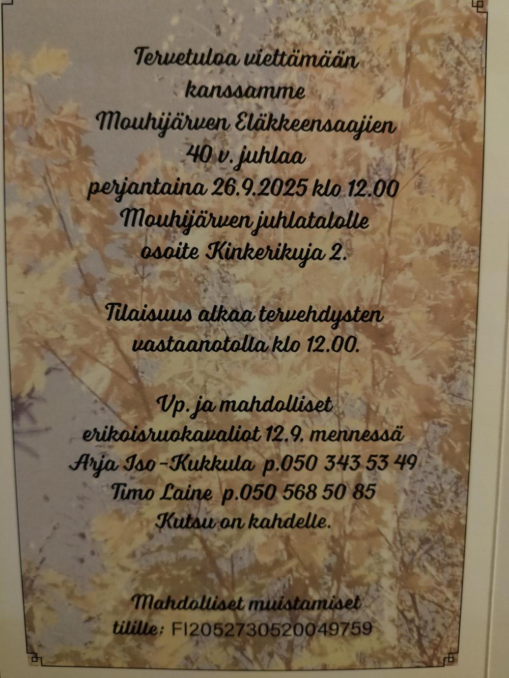 Mouhijärven Eläkkeensaajat ry perustettiin 26. syyskuuta 1985 , joten syyskuussa 26.9.2025 juhlimme Mouhijärven Juhlatalolla 40 vuotispäivää.
