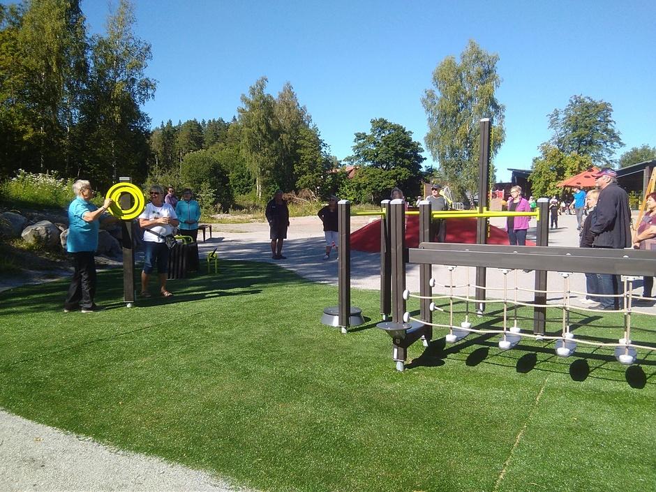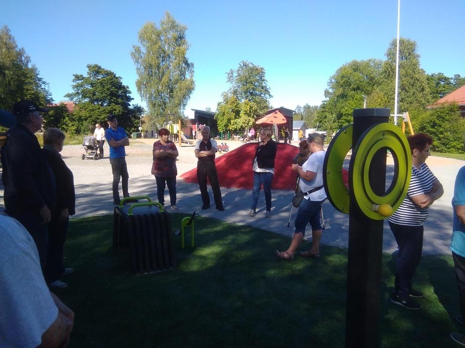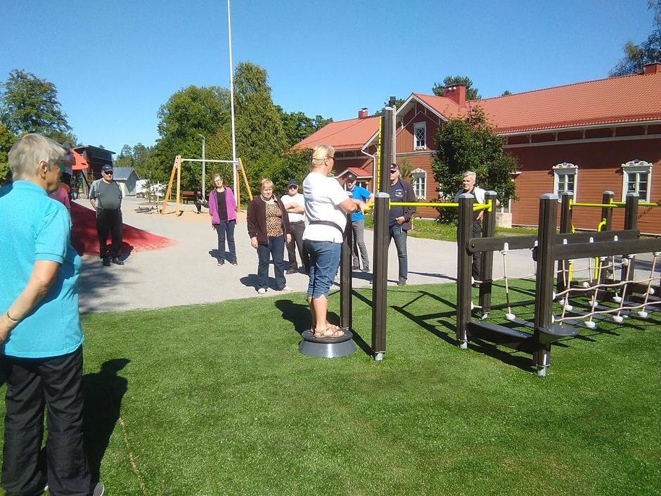 Mouhijärven Uotsolan toimintapuiston avajaiset 17.8.2020. Sirkku Pajunen opasti laitteiden käyttöä meille vanhemmille. Lapsille on omat keinunsa ym. toisessa päässä puistoa.