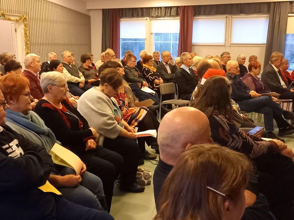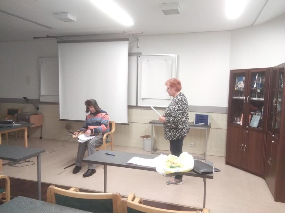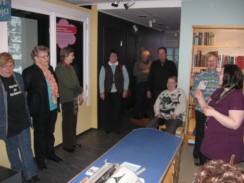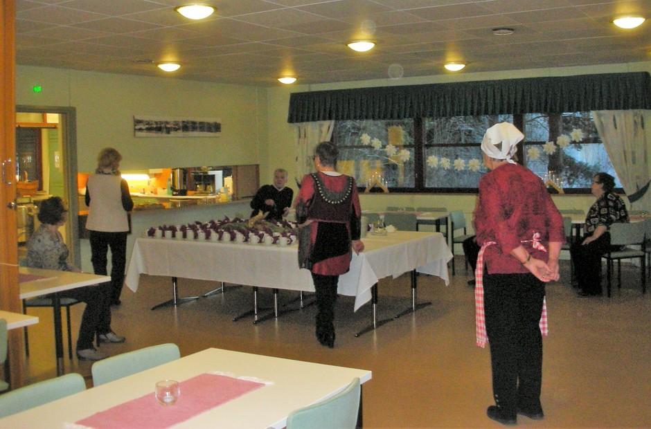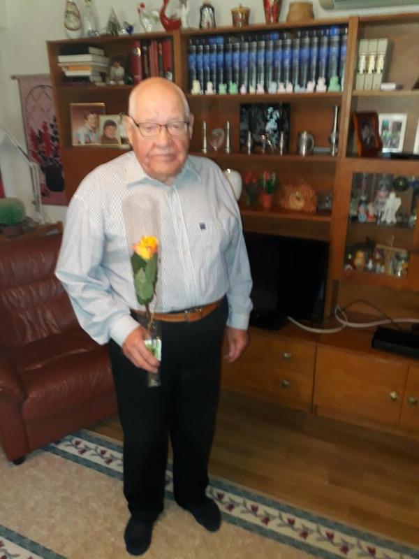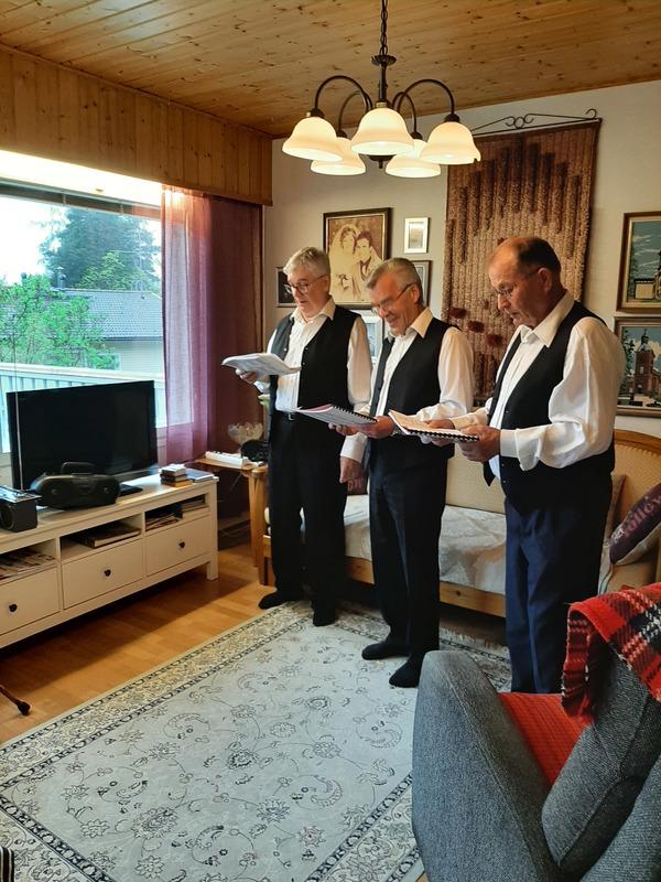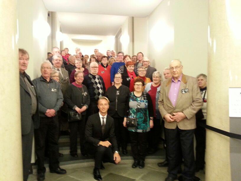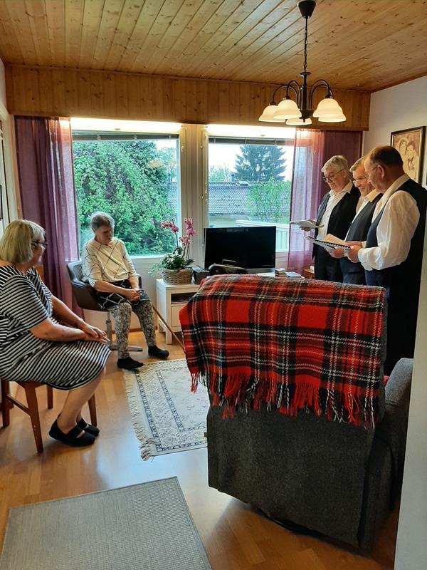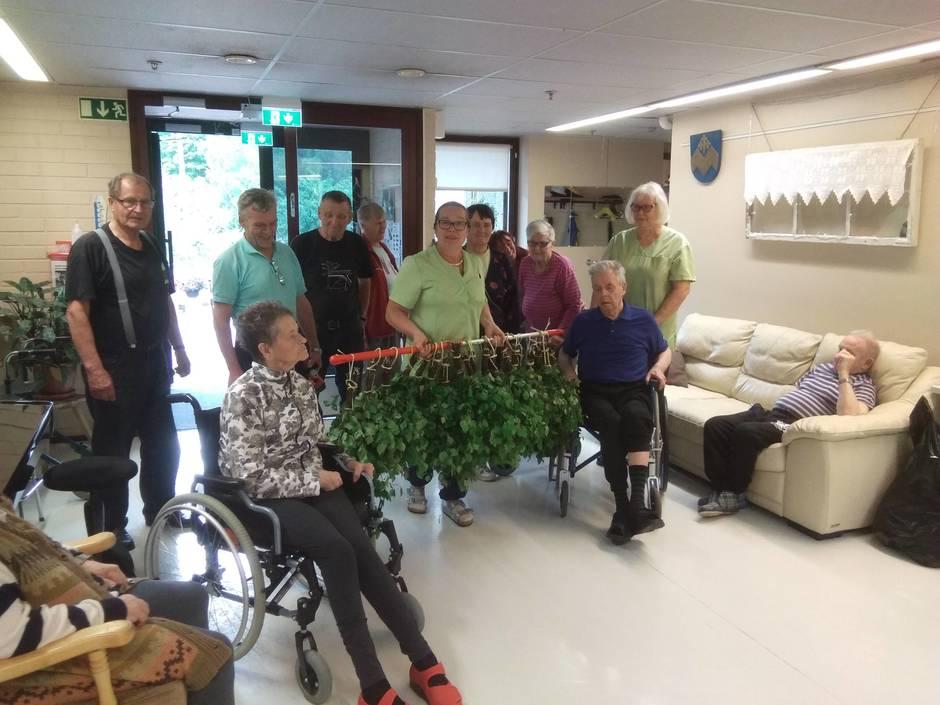 Yhdistyksen lähetystö kävi onnittelemassa lahjan ja laulujen kera. Kuvat otti Anna-Liisa Lamberg.