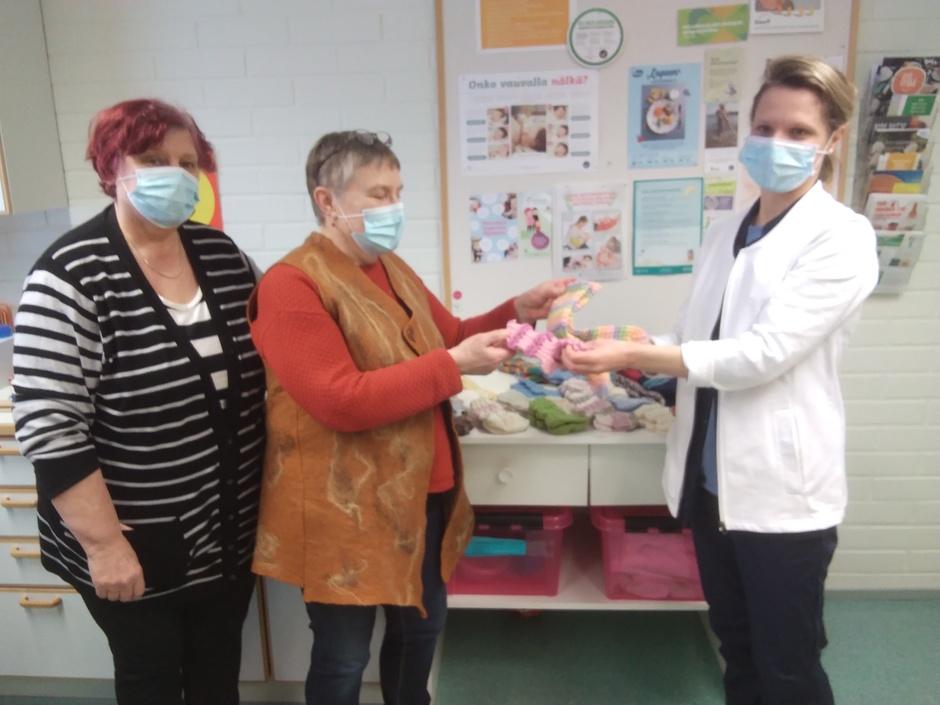 Terveydenhoitaja Tiamaria Nääppä vastaanotti Eläkkeensaajien kutomat sukat vastasyntyneille ja sisaruksille.
