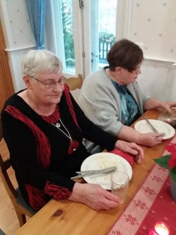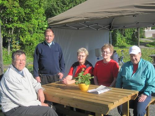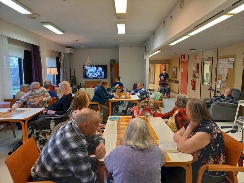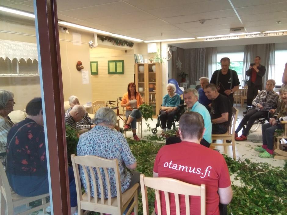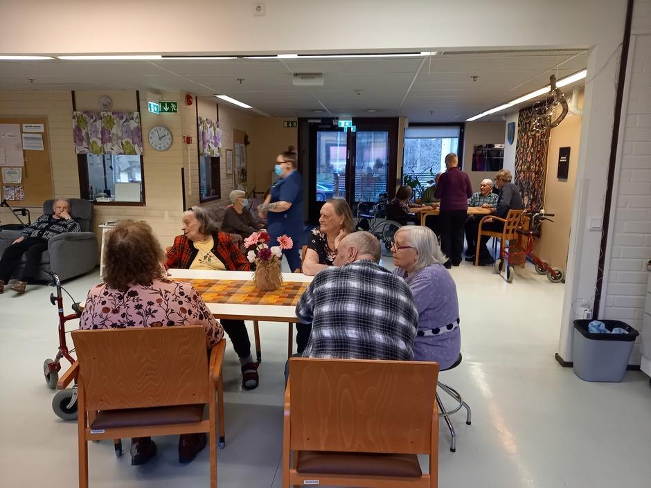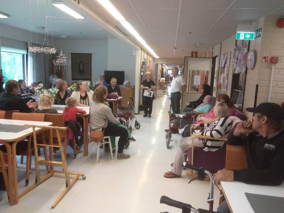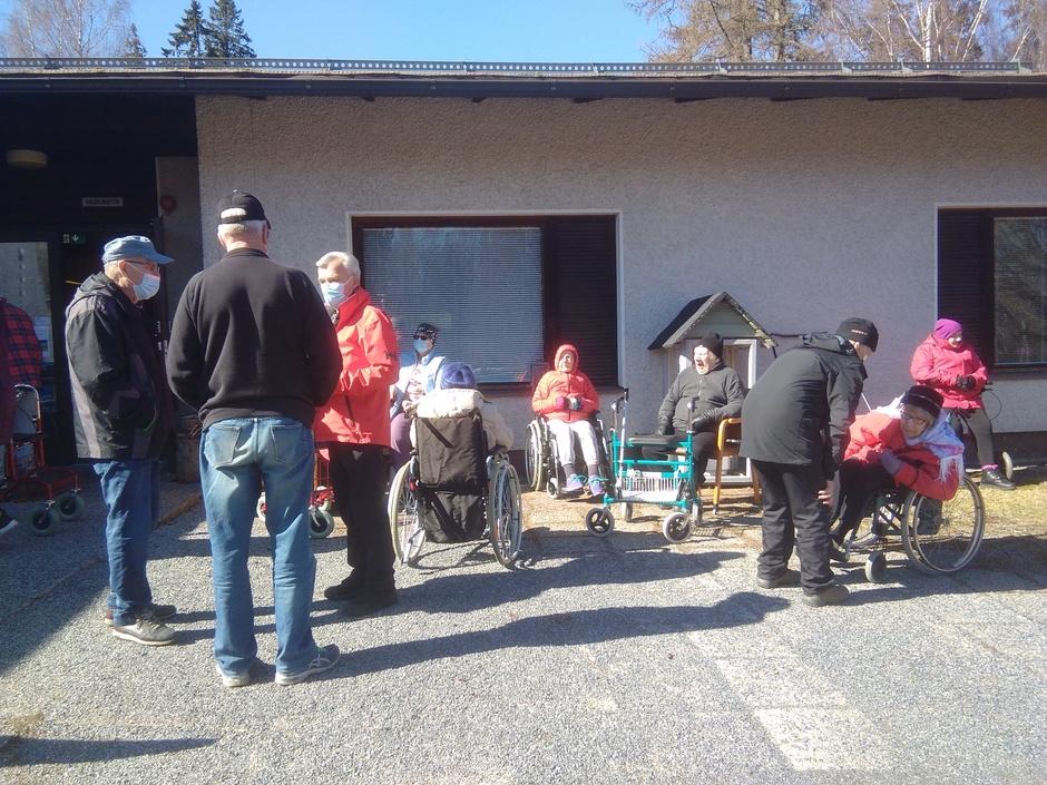 Rauhankodilla ulkoilemassa asukkaiden kanssa. Aurinkoinen sää juhlisti käyntiämme. Leenan ja Ritvan leipomien kakkujen kera joimme maistuvat kahvit ulkona.
