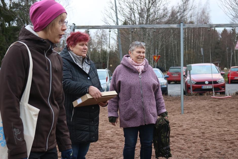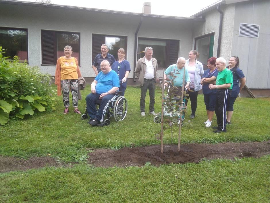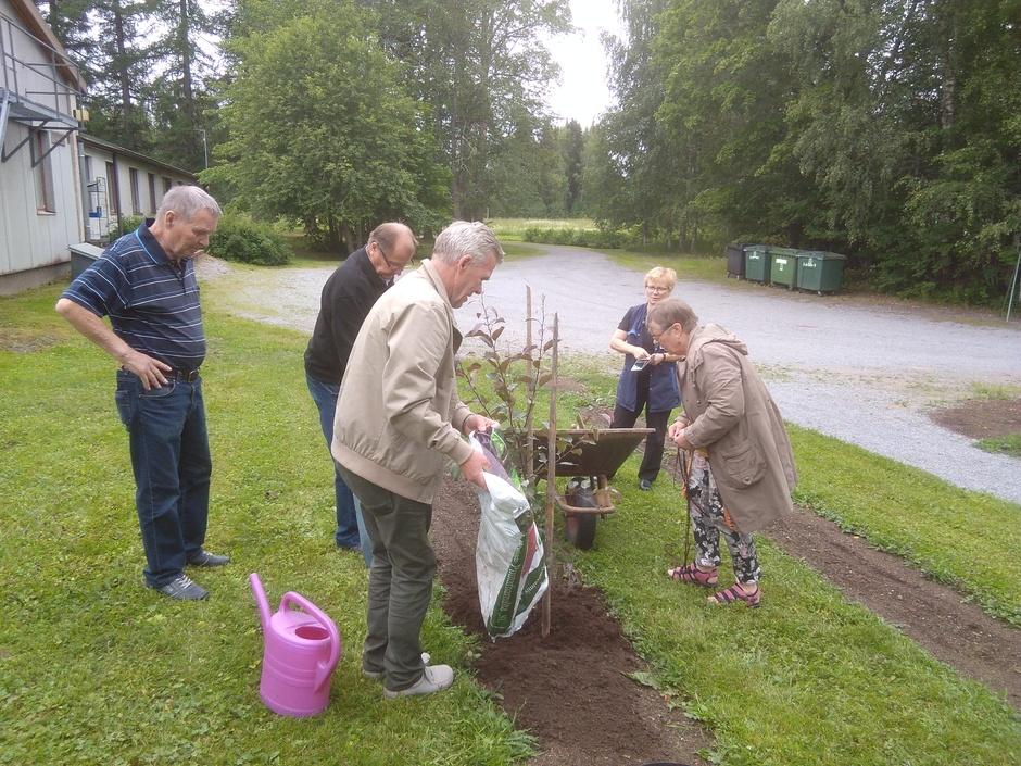 Eläkeensaajat veivät lahjaksi koristeomenapuun ja istuttivat myös sen.