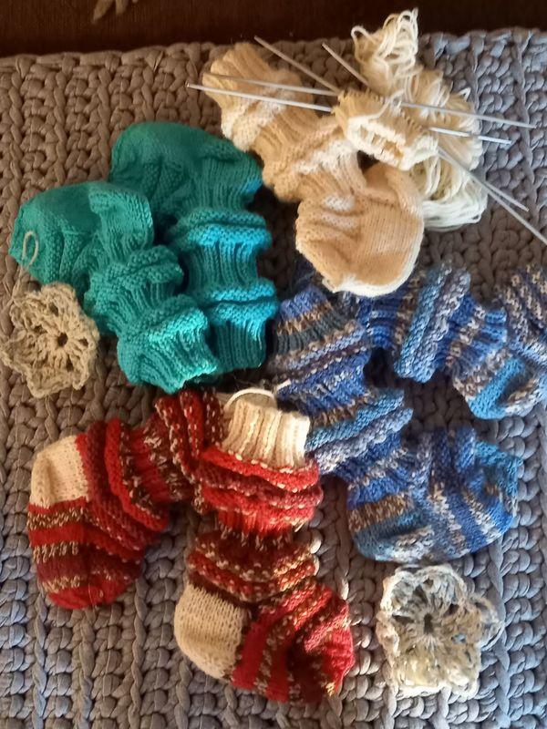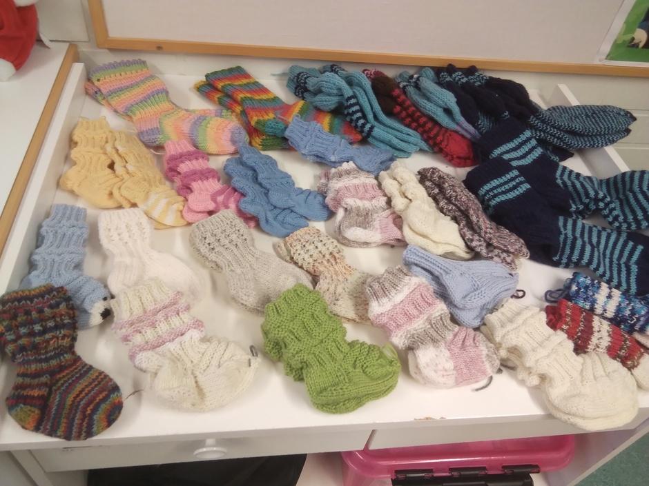 Eläkkeensaajat kutoivat taas vauvasukkia Mouhijärven lastenneuvolaan. Sukat luovutettiin 17.2.2021.