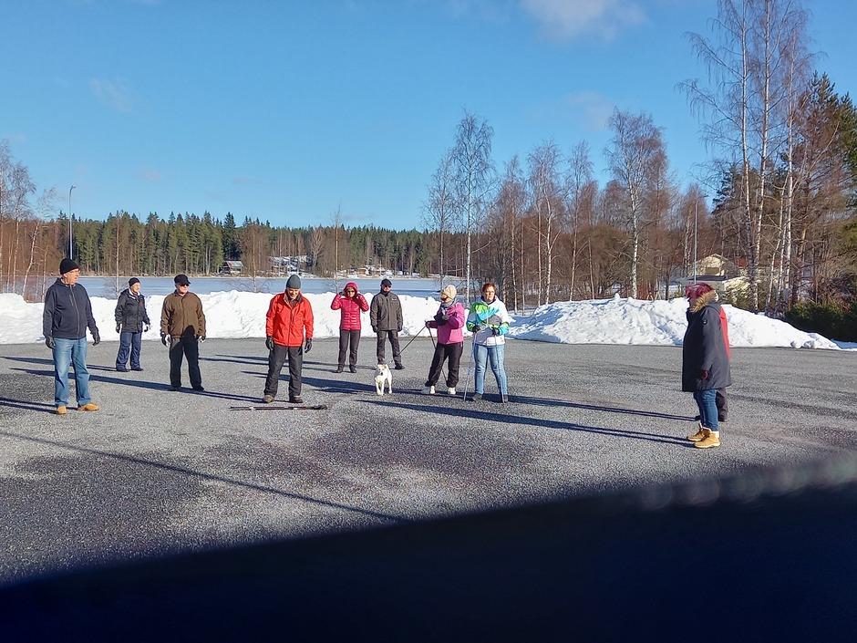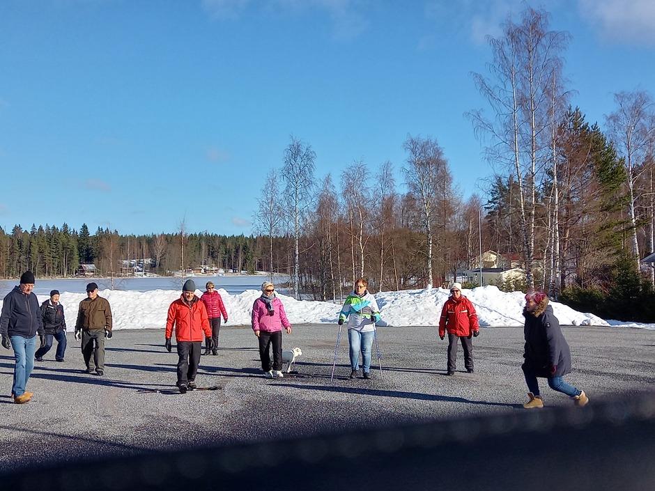 Liikuntakampanjan aloitus Uotsolan torilla 2.3.2021. Ensin pieni alkujumppa ja sitten lenkille.